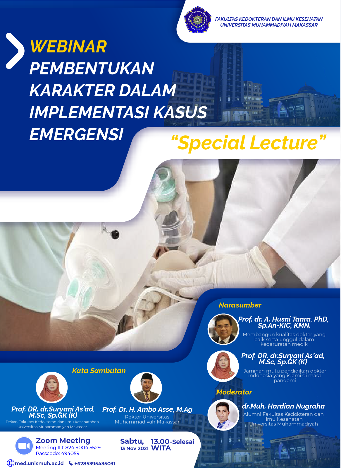 📢 Assalamu’alaikum Wr. Wb.📢 Fakultas Kedokteran dan Ilmu Kesehatan, Universitas Muhammadiyah Makassar mempersembahkan: *Webinar: Pembentukan Karakter dalam Implementasi Kasus Emergensi. “Special Lecture”.* Yang akan dilaksanakan